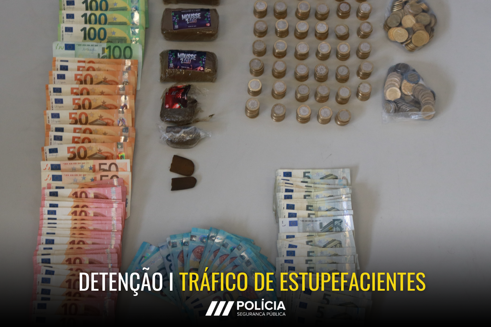 Face ao quadro de ilicitude, e recolhidos elementos probatórios suficientes, foi montada uma operação policial e, com recurso aos adequados meios de obtenção de prova, foi possível apreender cerca de 750 doses individuais da Haxixe, 13 doses de Liamba, matéria estupefaciente indeterminada, que se acredita ser droga sintética, e mais de 2500 euros em dinheiro.