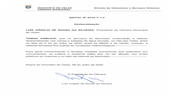 Município Velas - O Município informa que os Serviços do Município continuarão a efetuar desbaratização nas caixas e sarjetas de água pluviais, na Vila das Velas, entre os dias 20 e 24 de Julho de 2020, entre as 09h00 e as 16h30, contudo,