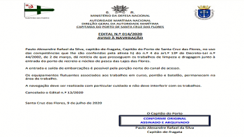 Edital 14/2020. Trabalhos Lajes das Flores EDITAL N.o 014/2020 - AVISO À NAVEGAÇÃO Paulo Alexandre Rafael da Silva, capitão-de-fragata, Capitão do Porto de Santa Cruz das Flores, no uso... Ver mais