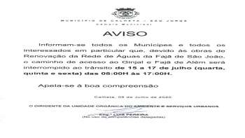 Município da Calheta AVISO Informam-se todos os Munícipes e todos os interessados em particular que, devido às obras de Renovação da Rede de Águas da Fajã de São João, o caminho de acesso ao Ginjal e Fajã de Além será interrompido ao trânsito de 15 a