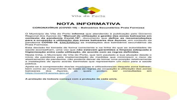 O Município de Vila do Porto informa que atendendo à publicação pelo Governo Regional dos Açores do “Manual de utilização e gestão das zonas balneares em contexto da pandemia Covid-19”, documento que define as recomendações para a ocupação e utilização das zonas balneares dos Açores, em contexto da pandemia COVID-19, ENCERROU as instalações dos balneários secundários da Praia Formosa.