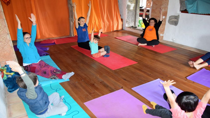 O nosso primeiro momento foi a aula de ioga com a participação das crianças. De