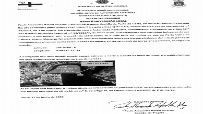 Edital 18/2020 – aviso à navegação local, que respeita ao estabelecimento de uma zona para a prática balnear, sem embarcações, no Porto Velho da Calheta, Ilha de São Jorge.