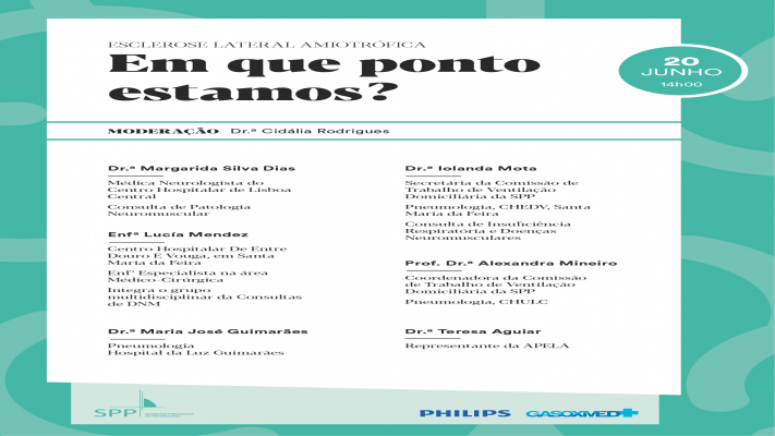 No sábado dia 20 de junho a Sociedade Portuguesa de Pneumologia vai promover o webinar “Esclerose Lateral Amiotrófica: em que ponto estamos?”. “O objetivo da sessão é esclarecer, divulgar e tomar consciência sobre uma doença que afeta pessoas de todo o mundo. Queremos ainda realçar a necessidade de mais estudos para que se possa chegar ao tratamento curativo da doença num futuro tão breve quanto possível”, referem Alexandra Mineiro e Iolanda Mota, que vão marcar presença nesta sessão.