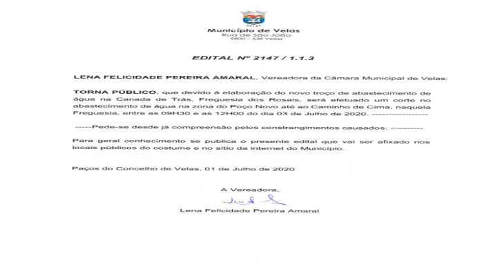 , município, velas, o, município, informa, que, devido, à, elaboração, do, novo, troço, de, abastecimento, de, água, na, canada, de, trás, freguesia, dos, rosais, será, efetuado, um, corte, no, abastecimento, de, água, na, zona, do, poço, novo, até, ao, caminho, de, cima, naquela, freguesia