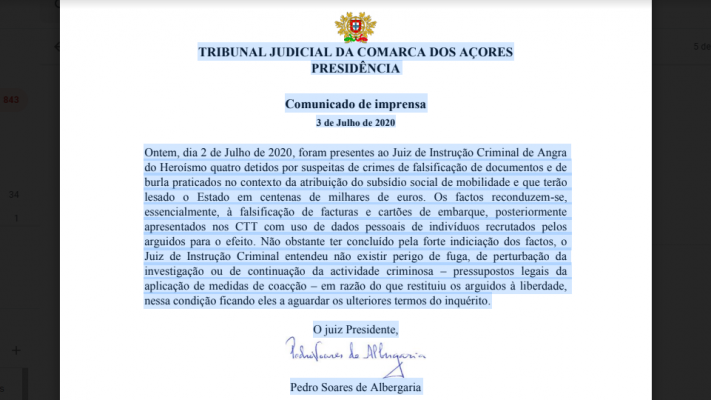 , “…, apresentamos, ao, juiz, de, instrução, criminal, de, angra, do, heroísmo, cinco, detidos, por, suspeitas, de, crimes, de, falsificação, de, documentos, e, burla, praticada, no, contexto, da, aplicação, do, subsídio, social, de, mobilidade…”, comunicado, de, imprensa, 3, de, julho, de, 2