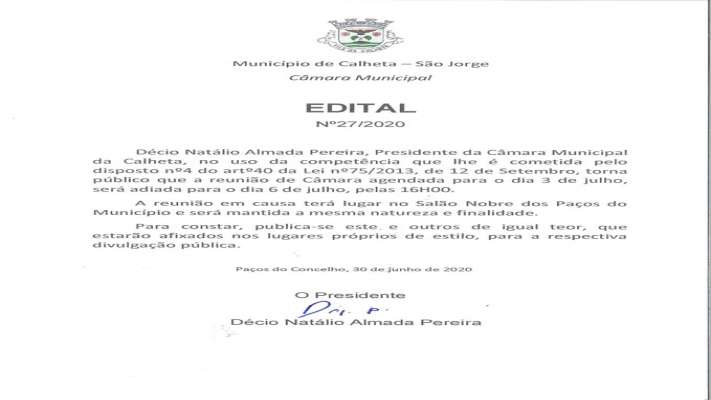 EDITAL 27/2020 Décio Natálio Almada Pereira, Presidente da Câmara Municipal da Calheta, torna público que a reunião de Câmara agendada para dia 3 de julho será adiada para o dia 6 de julho, | Jornal “O Breves”–“ Breves TV Online”
