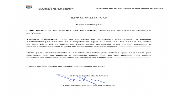 Município Velas O Município informa que os Serviços do Município continuarão a efetuar desbaratização nas caixas e sarjetas de água pluviais, na Vila das Velas, entre os dias 20 e 24 de Julho de 2020, entre as 09h00 e as 16h30, contudo, a referida ati...