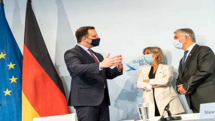 Jens Spahn, ministro alemão, que detém a presidência da União Europeia, acompanhado pela Ministra da Saúde portuguesa, Marta Temido (Portugal assume a presidência a 1 de janeiro de 2021), pelo Ministro da Saúde esloveno, Tomaž Gantar (Eslovénia assegura a liderança da UE no segundo semestre do próximo ano), e pela Comissária Europeia da Saúde, Stella Kyriakides, sublinhou a importância de estarem todos unidos na frente do combate à pandemia no decurso da conferência de imprensa após a reunião.