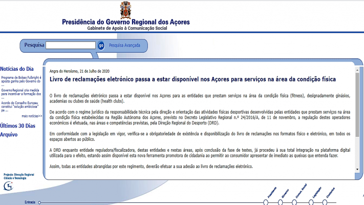 O livro de reclamações eletrónico passa a estar disponível nos Açores para as entidades que prestam serviços na área da condição física (fitness), designadamente ginásios, academias ou clubes de saúde (health clubs).