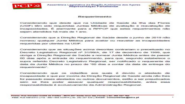 Requerimento - Considerando que desde que na Unidade de Saúde da Ilha das Flores (USIF) têm sido requeridas Juntas Médicas de avaliação e reavaliação de incapacidades. É alarmante para a RPPCP que estes requerimentos não sejam atendidos há mais de 1 an