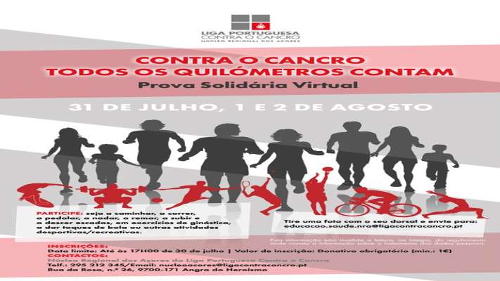 O Núcleo Regional dos Açores da Liga Portuguesa Contra o Cancro (NRA LPCC) promove, nas próximas dias 31 de julho, 1 e 2 de agosto, o projeto solidário virtual “Contra o câncer todos os quilômetros e contaminação”, ao nível do Município das Lajes do Pico se associa.