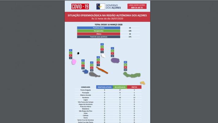 Com estes casos mais recentes, foram detetados na Região 171 casos de infeção pelo novo coronavírus SARS-CoV-2, que causa a doença COVID-19, verificando-se atualmente 16 casos positivos ativos, dos quais 15 na ilha de São Miguel e um na ilha Terceira.