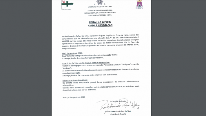 EDITAL 22/2020 - Aviso à Navegação Edital 22/2020 da Capitania do Porto da Horta – Aviso à Navegação, o qual se refere a trabalhos a executar no Porto da Madalena, Ilha do Pico.............https://mail.google.com/mail/u/0… Capitão do Porto da Horta...