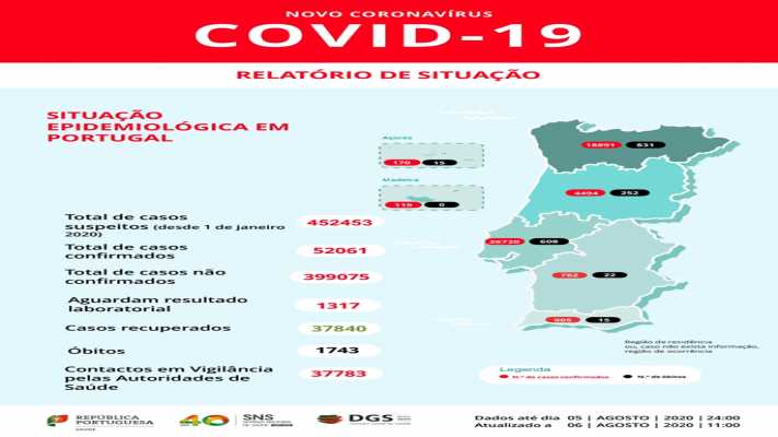 Já se encontra disponível o relatório de situação de hoje, 6 de agosto, que pode ser consultado integralmente em https://covid19.min-saude.pt/