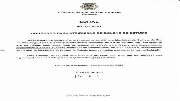 Décio Natálio Almada Pereira, Presidente da Câmara Municipal da Calheta da ilha de São Jorge, torna público que está aberto concurso, de 1 a 16 de outubro, até às 16h00, para "atribuição de bolsas de estudo para jovens que ingressem ou frequentem o ensino superior, particular ou cooperativo", de acordo com o Regulamento Municipal de Atribuição de Bolsas de Estudo (para consultar regulamento: cm-calheta.pt).