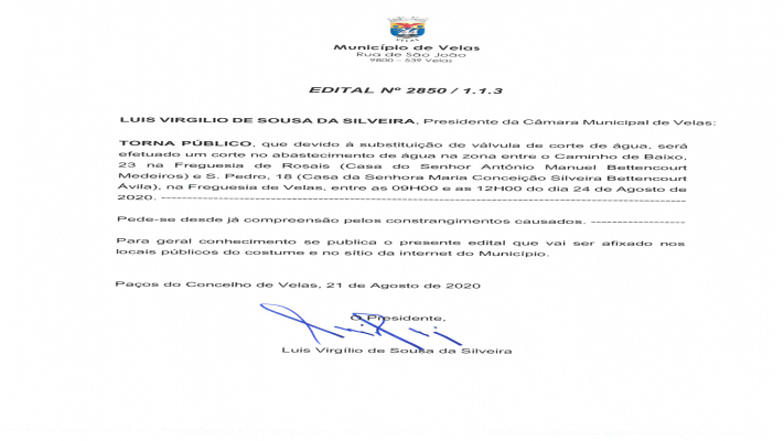 O Município informa que devido à substituição de válvula de corte de água, será efetuado um corte no abastecimento de água na zona entre o Caminho de Baixo, 23 na Freguesia de Rosais (Casa do Senhor António Manuel Bettencourt Medeiros) e S. Pedro, 18 (Casa da Senhora Maria Conceição Silveira Bettencourt Ávila), na Freguesia de Velas, entre as 09H00 e as 12H00 do dia 24 de Agosto de 2020 ........ Município Velas @municipiovelas - Página inicial ...... ........... http: //cmvelas.pt.DESTAQUES.