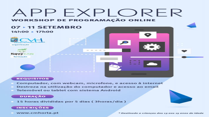 , município, da, horta, -, workshops, de, programação, (online), -, app, explorer, desenvolvimento, de, aplicações, para, smartphones, mais, informações, https//www, cmhorta, pt/index, php/informacao/destaques/2534-workshops-de-programacao-online, https//www, facebook, com/