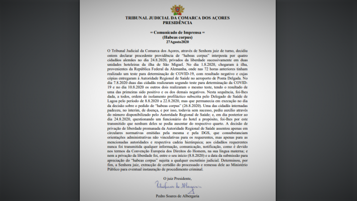 O Tribunal Judicial da Comarca dos Açores, através de Senhora juiz de turno, decidiu