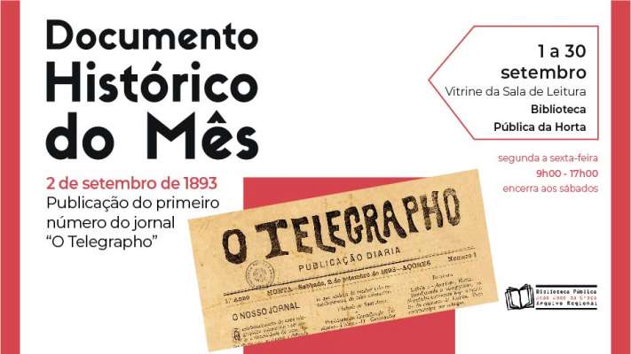 A Direção Regional da Cultura, através da Biblioteca Pública e Arquivo Regional João José da Graça, na Horta, apresenta, entre 1 e 30 de setembro, mais um “Documento Histórico do Mês”, que estará patente na vitrine da Sala de Leitura.