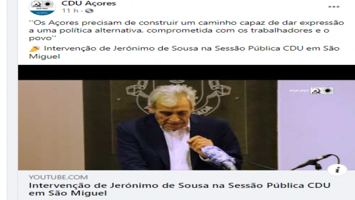 CDU Açores 1tSgpon1snogm rdherd  ·     '' Os açores precisam de construir um caminho capaz de dar expressão a uma política alternativa, comprometidos com os trabalhadores e o povo ''  Intervenção de Jerónimo de Sousa na Sessão Pública CDU em São M...
