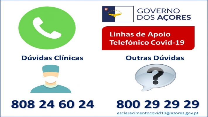 O Governo dos Açores disponibiliza ainda a Linha Açores de Esclarecimento Não Médico COVID-19, com o número 800 29 29 29, que pode ser utilizada entre as 08h30 e as 18h30, nos dias úteis, e a Linha RIAC 800 500 501, que funciona de segunda-feira a sábado, das 09h00 às 22h30, e aos domingos, das 10h00 às 22h30.