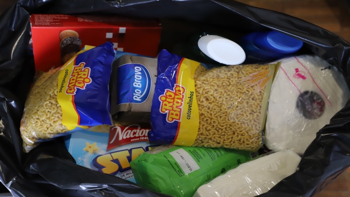 Os cabazes foram preparados de acordo com o agregado familiar e incluem géneros alimentares como azeite, farinha, açúcar, leite, arroz, massa, entre outros alimentos.