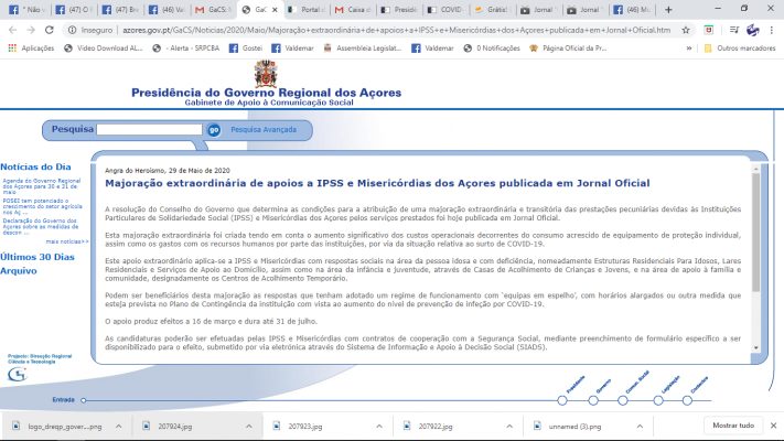 Majoração extraordinária de apoios a IPSS e Misericórdias dos Açores publicada em Jornal Oficial Angra do Heroísmo , 29 de Maio de 2020 A resolução do Conselho do Governo que determina as condições para a atribuição de uma majoração extraordinária e t...